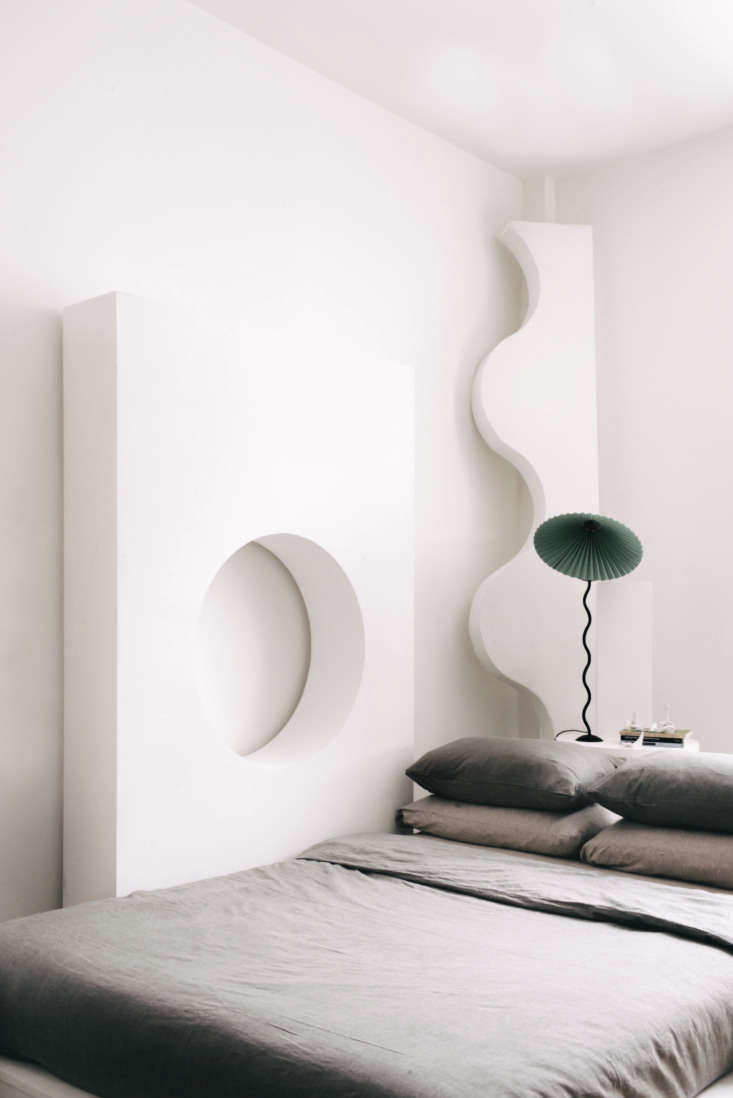 In addition to making art and lamps, Piccolo designs interiors and sets with Charlotte Taylor, a friend from art school—their business is called Dello Studio (website and furniture collection to come soon: stay tuned @dellostudio). The curved floor shelf is a leftover prop from one of their sets: “it started as a storage problem, but ended up working well here.”