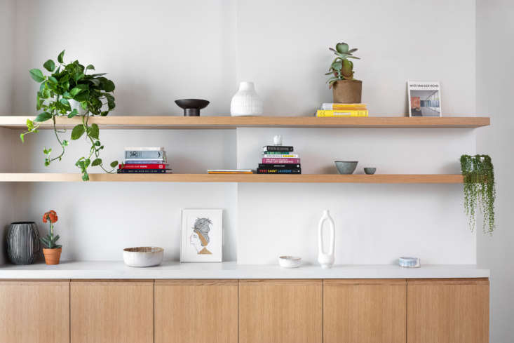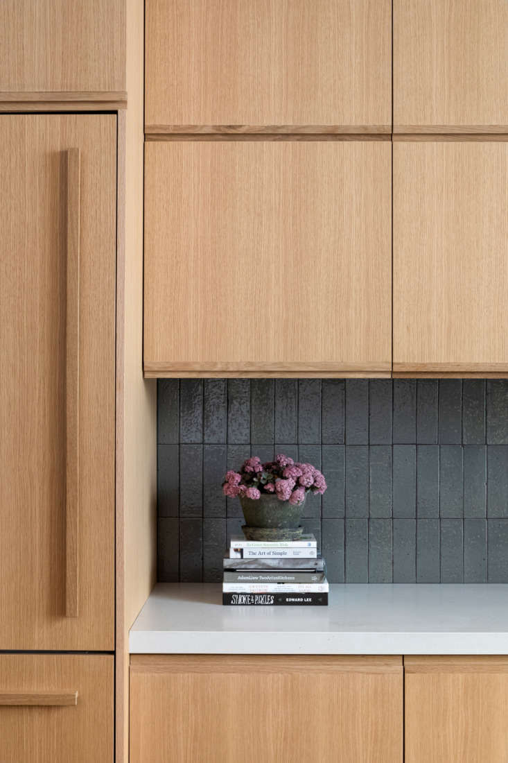 Above: A sideboard of rift-sawn white oak cabinets with Caesarstone counters runs alongside the far wall. The sculptural white bud vase on the bottom shelf is by Simone Bodmer-Turner.