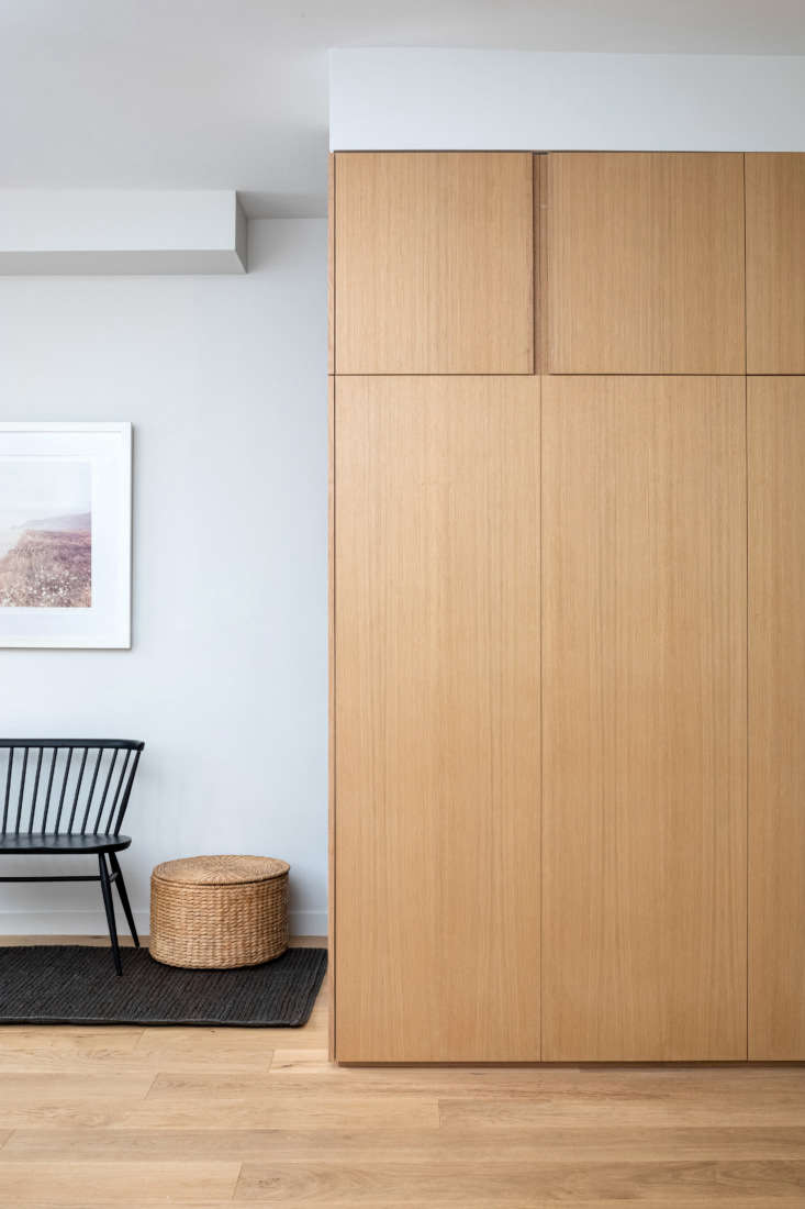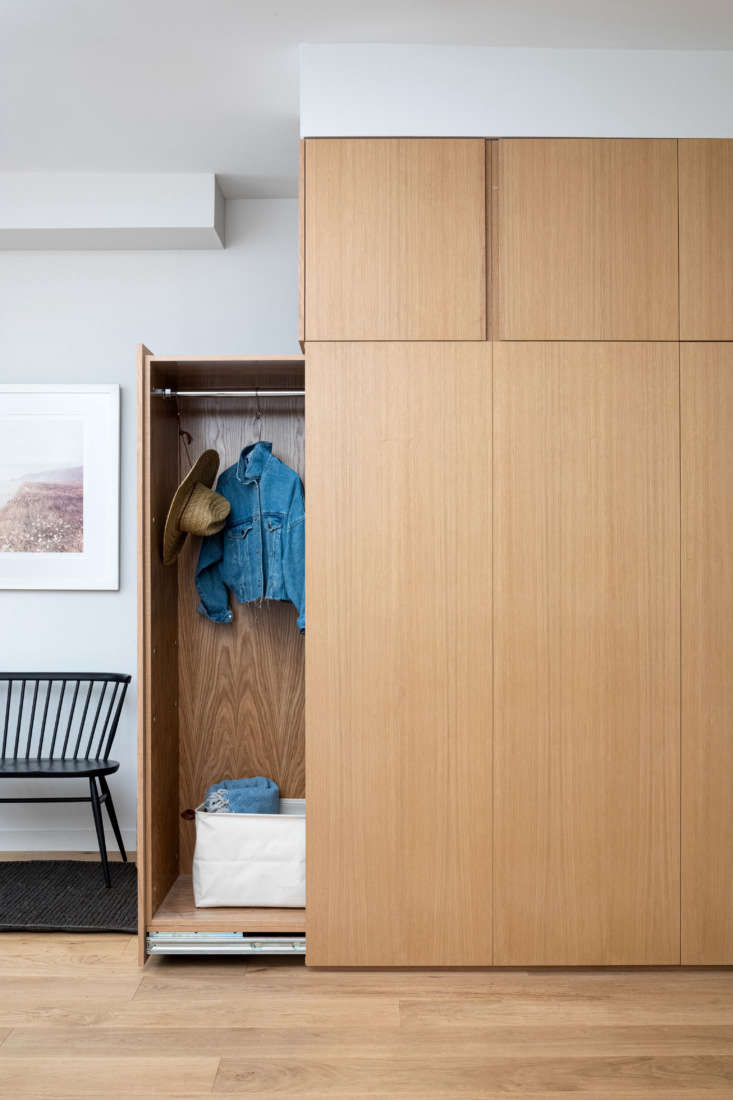 Above: In lieu of a door, the closet pulls out. “We liked the seamless look and feel but it’s also functional,” explain the designers. “The pull faces the front entrance; it’s easy to use and works very well.”