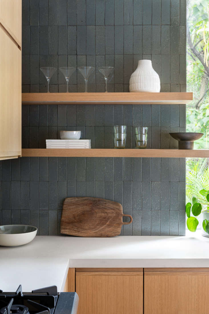 Above: Textural Thin Brick Tiles from Clé  serve as backsplash and backdrop for the open shelving next to the sink.