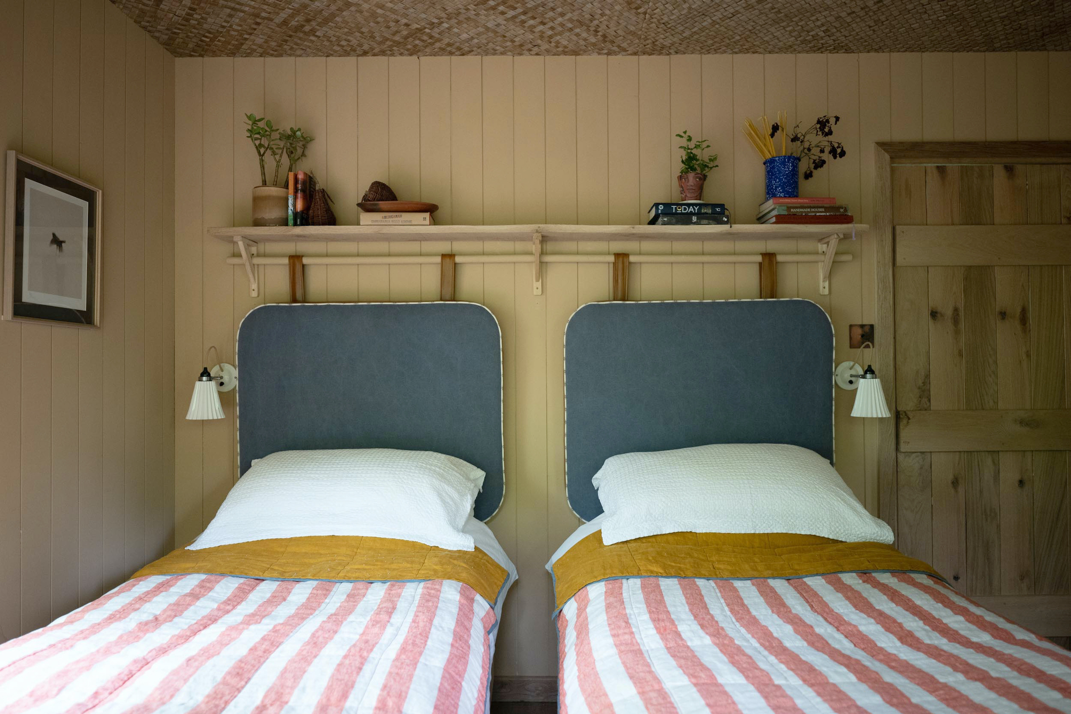 Two twin beds pushed together equals a king-size bed (“super king” by UK standards). With that simple equation in mind, Harriet Churchward and Matt Pescod of The Quist—see The King of Treehouse Hotels in the UK—came up with a clever headboard that allows them to offer guests an inviting bedroom with either two twins or a king-size bed.