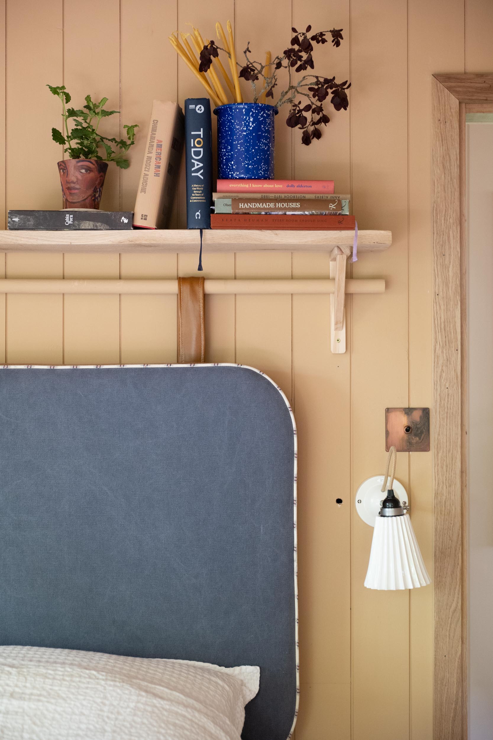 Note that Harriet sized the headboards “high rather than wide” to leave room for wall-mounted bedside lights: Original BTC’s Hector Pleat sconces.
