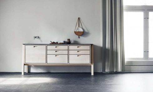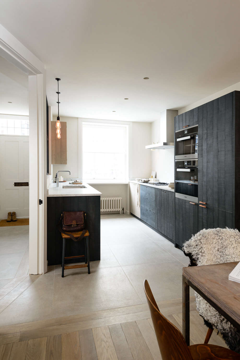 Above: The cabinets are made of British-grown sustainable woods: Birch plywood frames are fronted by cabinet doors of band-sawed solid beech that’s stained (rather than painted) an inky blue-black. The flooring is a maplike confluence of concrete and oak.