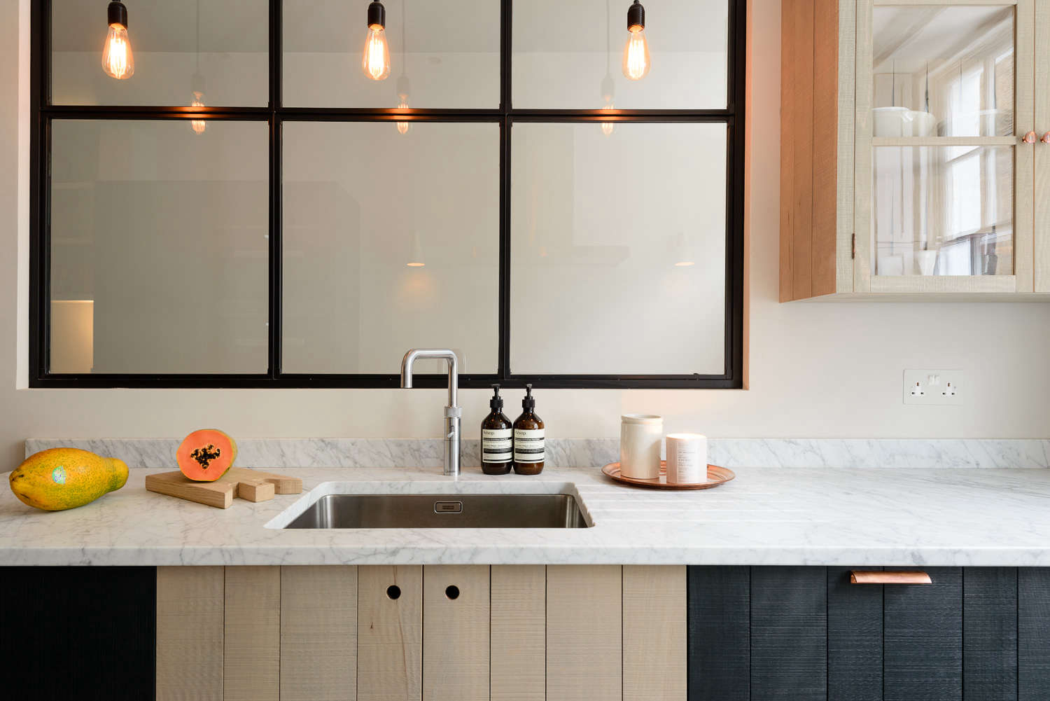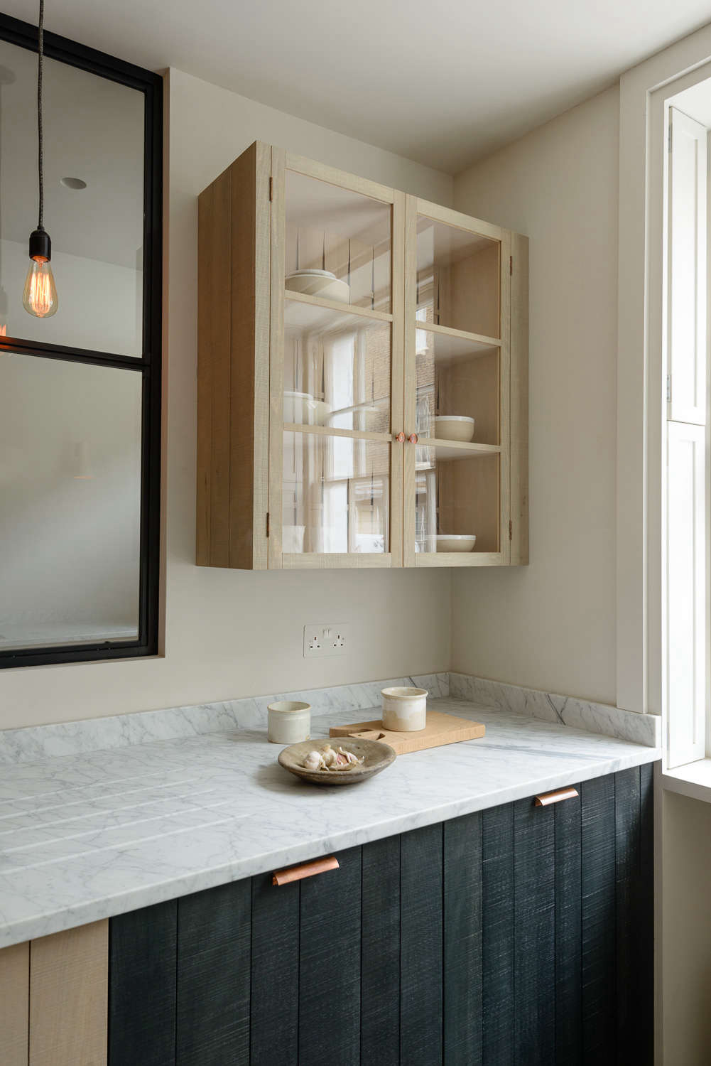 Above: The hanging lights were a DIY project: LED Filament Bulbs and Bakelite Bulb Holders are paired with Fabric Lighting Cable, all from Dowsing & Reynolds. The Crittall window echoes the lines of the sash window at the back of the space that fills the room with light.