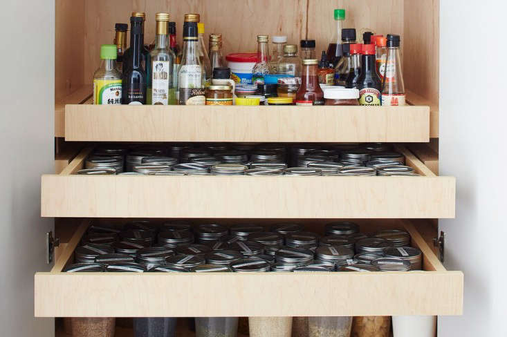 Above: A pantry is stocked with pullout drawers of maple ply–”very cost-effective,” says Brad, “we also used it inside the staff kitchen cabinets.”