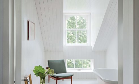 The pedestal table is from Crate & Barrel and the leather Folding Stool came from Urban Outfitters. The paneling is MDF: “We cut down four by eight boards into four-inch strips,” says Brad. “Pine was too expensive, but we were able to achieve the look.” The wall is painted Benjamin Moore Icicle, a warm white with a slight hint of green.