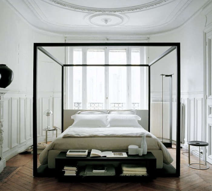 Above: Designed by Patrizia Cagliani, the Asseman Canopy Bed has a white-painted tubular iron frame with a ceiling of white cotton or white tulle mosquito curtain; available through Suite New York, inquire about pricing.