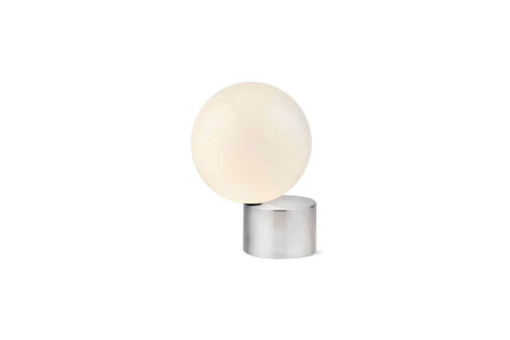 Above: Michael Anastassiades’s Tip of the Tongue Table Lamp is made with a hand-blown opal glass globe on a nickel or brass base; $995 at Design Within Reach.