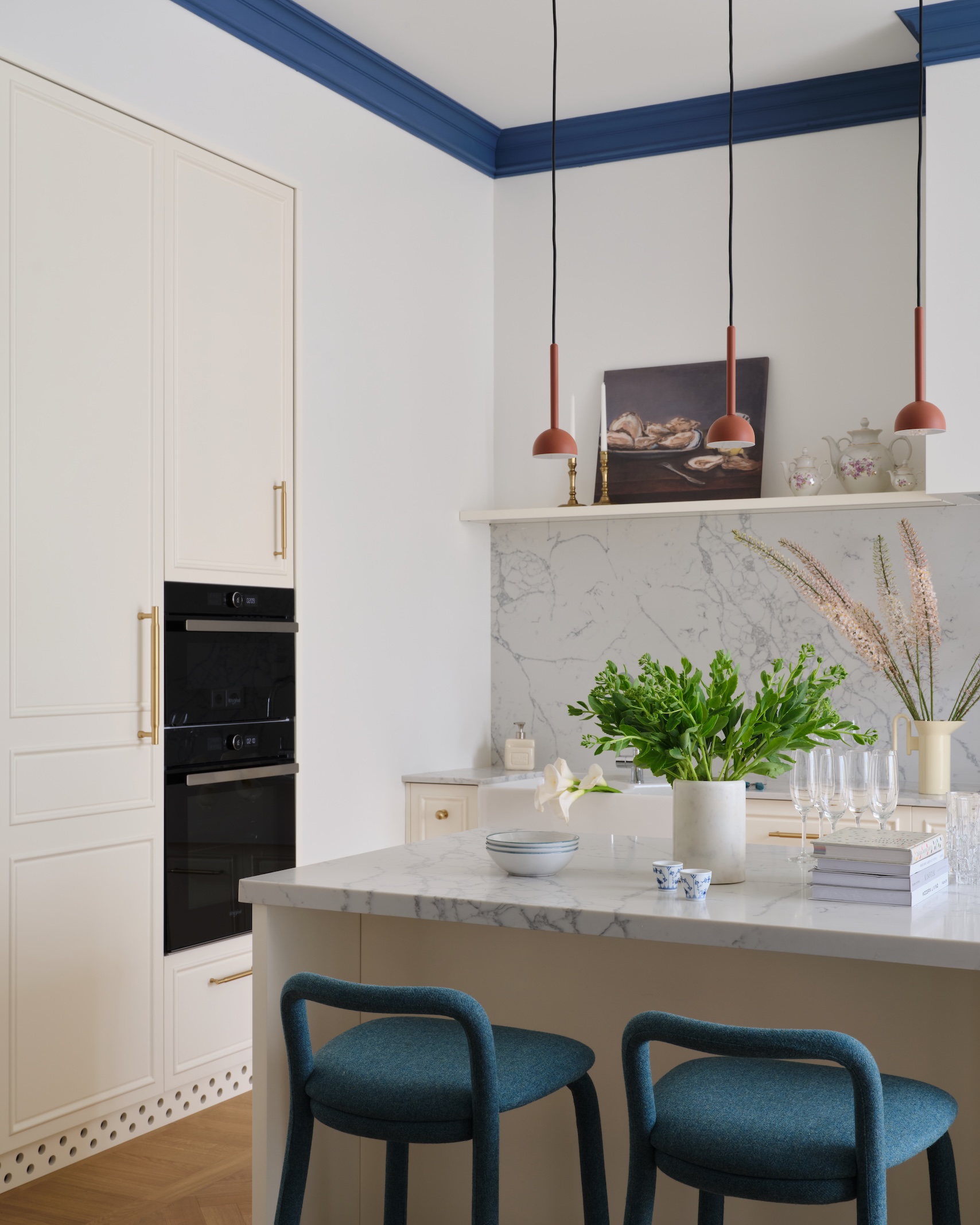 Above: Located in a new building, the apartment was raw space with no walls when Fariz was called in. He used folding glass doors to link the living room and kitchen, and says he wanted the latter to feel “both light and characterful: I initially planned to paint it blue to match the doors and cornices, but as the design evolved, we decided to go with softer tones to keep the view from the living room airy.”