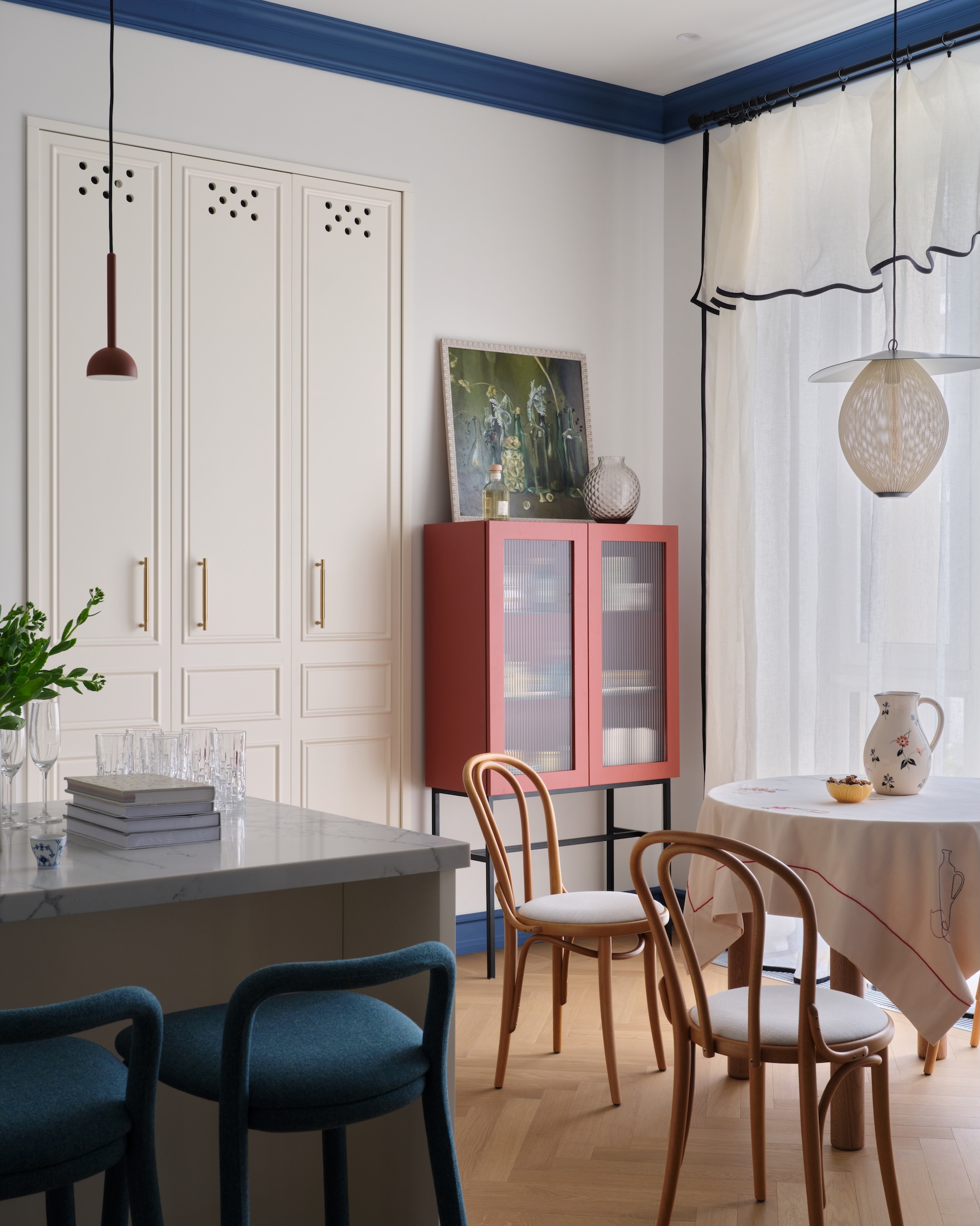 At Remodelista, without knowing any of this, we took note of Fariz’s website (courtesy of Karine) and were intrigued by a pied-à-terre in Almaty that he designed for empty nesters. In particular, we liked the apartment’s blue-trimmed kitchen with ventilated cupboards, a café table, and a hard-to-pinpoint mashup of references. Currently at work on a house for these same clients, Fariz was happy to fill us in on the project.