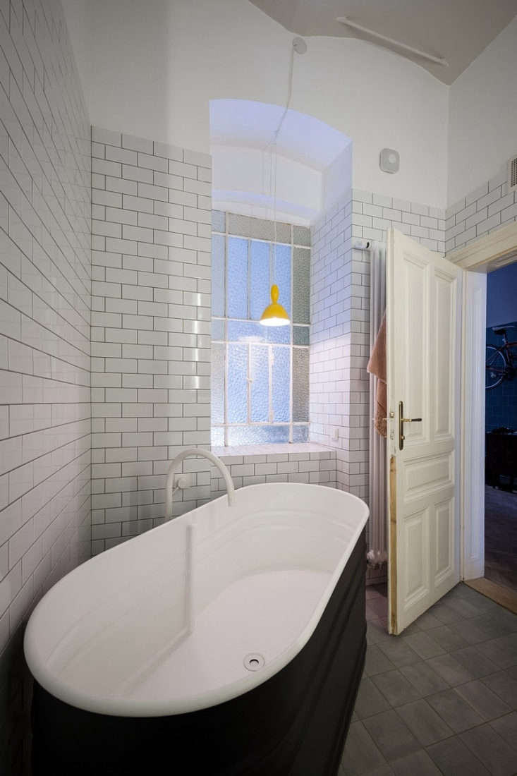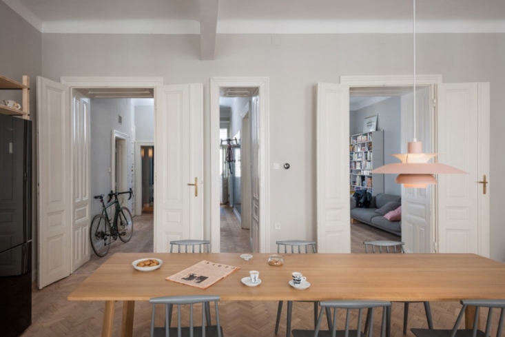 Hanging front and center on the walls of the spacious entry are the owners’ bikes. “The bikes…have a special meaning for the owners—they are not only their primary means of transportation but an expression of urban freedom,” says Blaž Kandus, co-founder of Kombinat Arhitekti, an architecture firm based in Ljubljana, Slovenia, that worked on the remodel. “The character of the apartment and its owners is expressed in this spacious entry hall.”