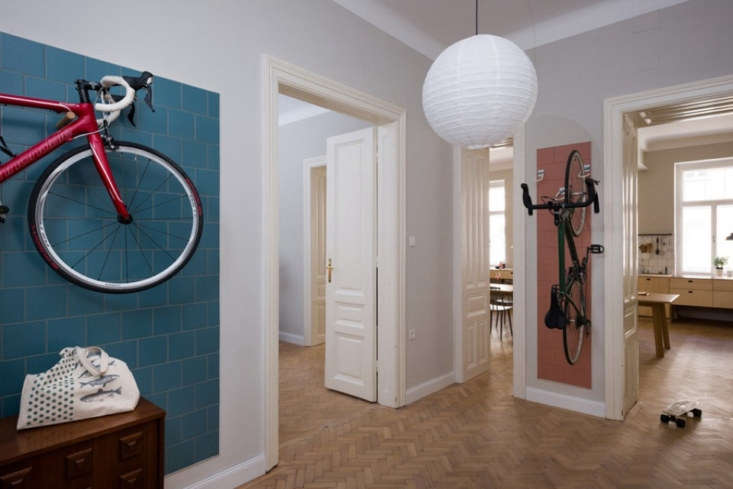 We get why so many urban dwellers we know prefer bikes to cars. Aside from the environmental reasons, finding parking for four wheels on city streets can be a real doozy, while finding parking for two wheels can be as easy as strolling through the front door. And now that we’ve seen this charming apartment in Vienna, we realize there’s yet another compelling reason to chose bikes: They make great art.