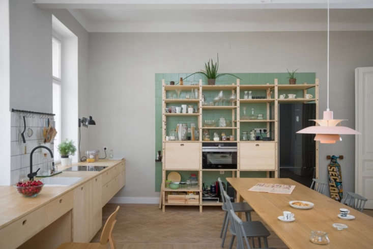 Above: The largest room is the kitchen, which the couple also uses as an office and meeting space. “The kitchen is completely custom; ash wood was used for the cabinets and shelving,” says Blaž.,