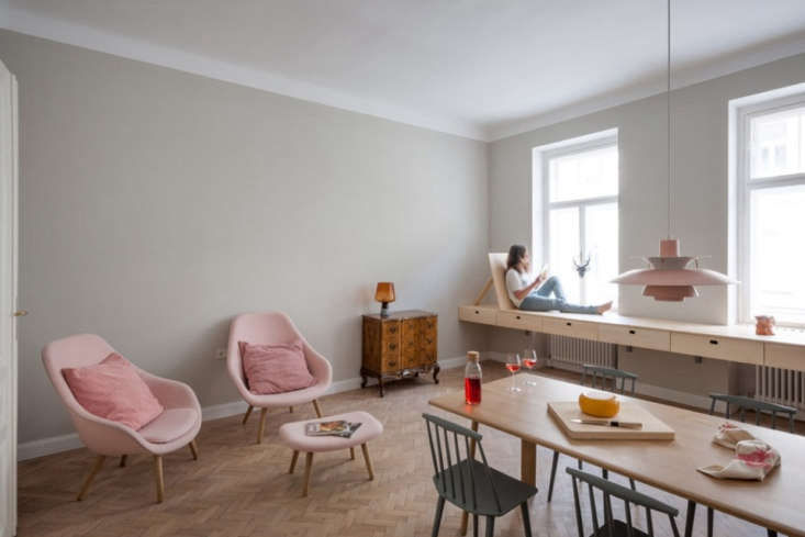 Above: “This is the place to cook, eat, read, and write, but first and foremost, it is a place to gather and meet. The enlarged room functions as the apartment’s public space. The long table can host lunches, work-related meetings, or both at once.”,
