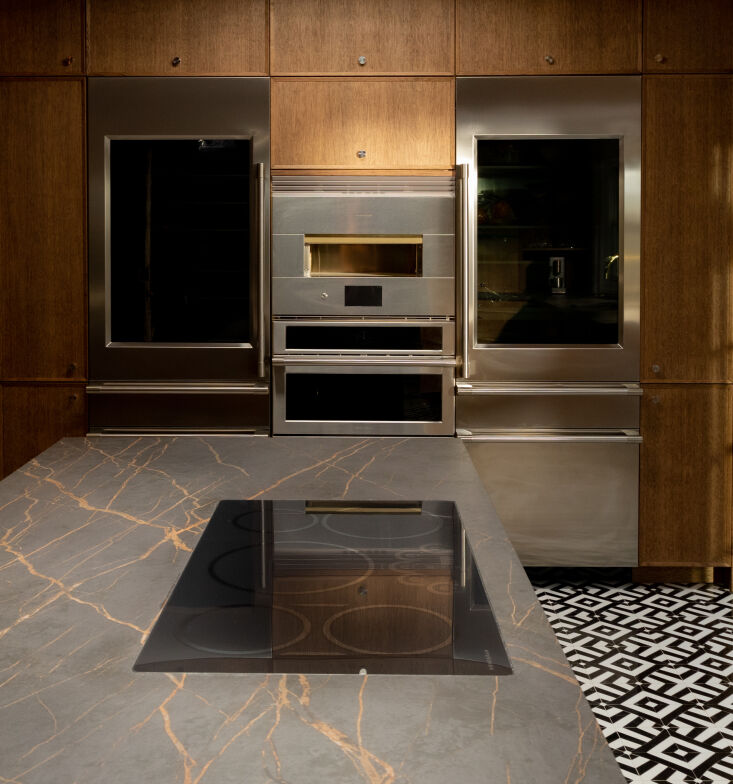 The counters and expansive island are topped with Cosentino Dekton, a solid surface in brown-black with gold veining. At Marcus’s request, the island is inset with a Monogram 36-inch Induction Cooktop that’s perfectly flush, so it can be used for serving. For chopping, the chef has a collection of cutting boards that tuck into vertical storage slots by the sink.