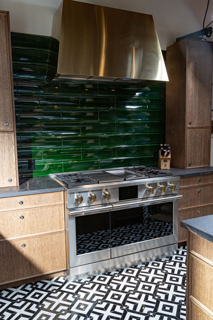 Above: The range has solid brass burners with precise temperature settings. The brass hood is a discontinued Monogram design. The backsplash is Artistic Tile’s Inverso Verde Field Dimensional composed of 6-by-18-inch fluted ceramic tiles.