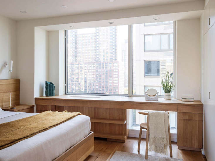Above: In a compact apartment by New York-based Workstead, custom oak millwork creates a desk/vanity, clothes storage, and countertop, all in one. Also included: built-in nightstands with drawers. See The Artful Shoebox Apartment, Workstead Edition for more.