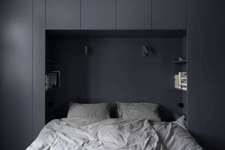 Above: A built-out wall of cabinets creates a nook for a bed—and hidden shelves within reach. See A Darkly Romantic House in Sweden by Skälsö Architects for more.