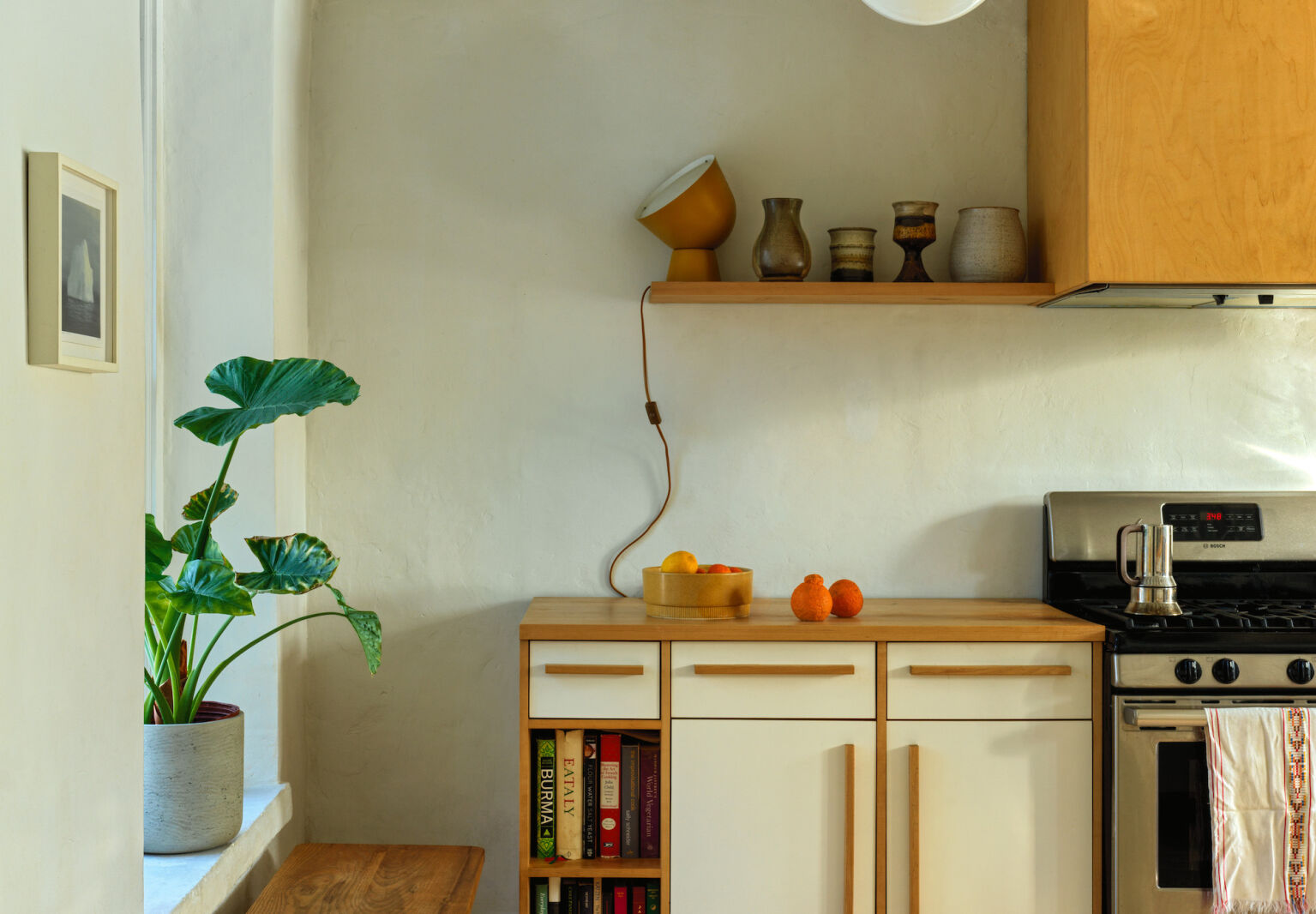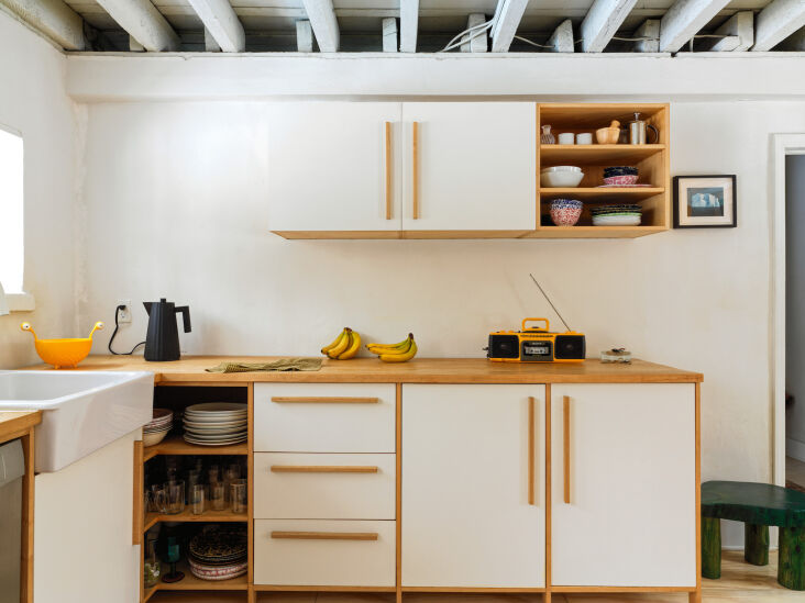 That’s not to say that the sole way to achieve an “uncommon” kitchen is via color and pattern (though that’s certainly an effective method, one that dominates the projects covered in the book). In fact, the kitchen that appealed to us most from Sophie’s book is mostly white, albeit with a few pops of color, and skews minimalist. It belongs to architecture and interiors photographer Chris Mottalini and his wife, Nepal Asatthawasi. Chris shot several of the projects that appear in the book, and when Sophie glimpsed his Hudson Valley space, she knew it had what it takes to make the book’s roster of big-personality kitchens, many by established designers like Justina Blakeney and Reath Design. Chris’s kitchen is small and simple, but it shares a similar think-outside-the-kitchen spirit.