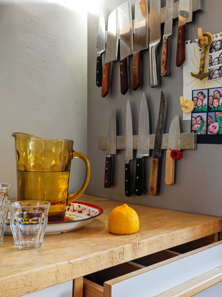 Above: Magnet knife holders both store and display their robust collection of kitchen knives. The countertops are solid maple, and the cabinets are plywood with laminate fronts.