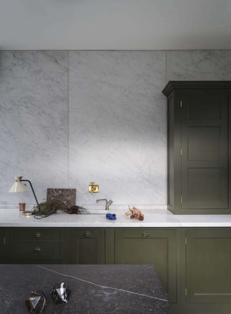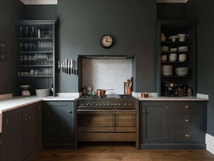 Above: Shaker-style cabinets in a North London kitchen by designer/manufacturer Plain English are painted army green (even the bin pulls), with exposed brass hinges. (See Kitchen of the Week: A Subtly Splendid Kitchen in North London for more.) Photograph courtesy of Plain English.