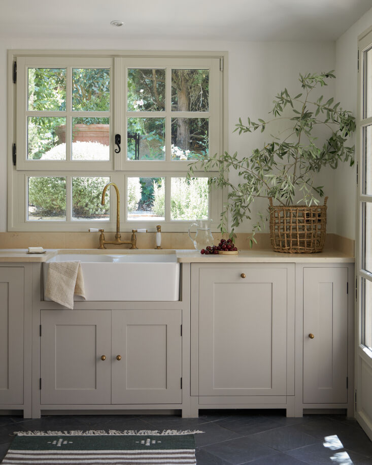 Above: Shaker fronts by Closa of Tetbury, England, are painted in a pale gray shade from Mylands. Photograph by Sarah Button, courtesy of Lauren Olivia Design from Organic Architecture on the Côte d’Azur: A Jacques Couëlle Villa with a New Kitchen Extension.