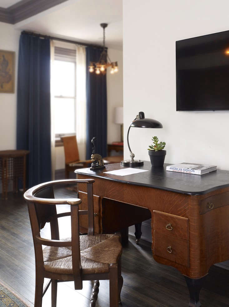 Above: An antique desk and reading lamp in a suite. Vintage furniture was sourced from an estate sale on the Bowery, among other places. Here and there, the 21st century tiptoes into the rooms: note the barely noticeable television screen on the wall.