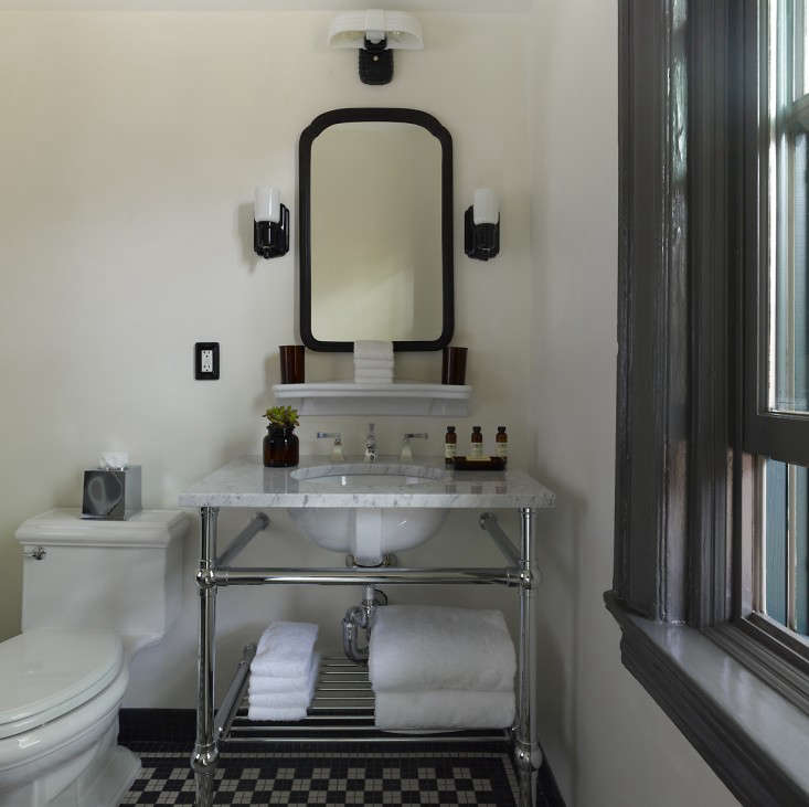 Above: The bathrooms have black-and-white tiled floors and Kohler marble-topped sink stands. We have a hunch the vintage-style lights came from Rejuvenation: see the Rufus two-light wall bracket. We like the way the window frames in the rooms, as well as the mantels, are painted in Stone, a warm gray from Benjamin Moore.