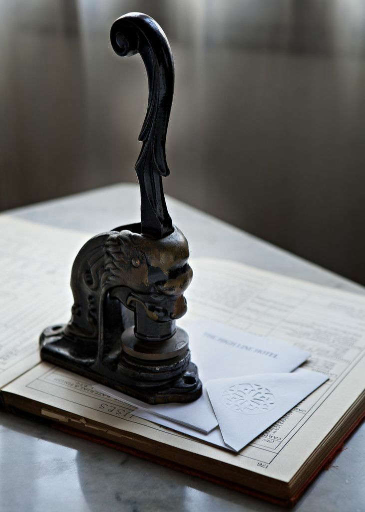Above: Roman and Williams planted every desk with an antique cast-iron embosser for embellishing hotel stationery with a geometric circular design, a pattern taken from the building.