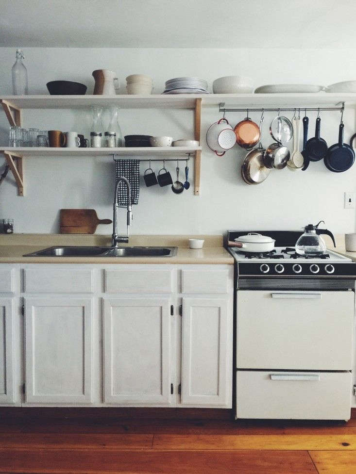 Above: Suzie Ryu and Kana Philip used Home Depot’s Behr Ultra Pure White to transform their kitchen from a dark 1980s nightmare to Scandi dream, all for $350. In their weekend retreat in Chatham, New York, Brooklyn ceramic artist Suzie Ryu and painter/furniture designer Kana Philip had only 48 hours at a time to get work done. Fortunately two weekends was all the time they needed to remake their galley kitchen. First they removed heavy upper cabinets, replacing them with open shelves made from Home Depot sourced pine boards. These along with the walls and cabinets received a fresh coat of paint. After rounding out the look with inexpensive Ikea accessories and Suzie’s own ceramics, the laminate counter doesn’t look so bad. (See more at Before & After: The $350 DIY Kitchen Overhaul in Two Weekends.)