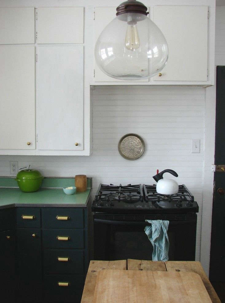 Abbey Hendrickson of Aesthetic Outburst, described her kitchen in Oswego, New York, as “a perfect storm of 1970s renovation work.” She and her husband Phil conjured a more timeless look with a two-toned approach: dramatic black on the lower cabinets and airy white above. Brass hardware with Martha Stewart Living Bedford Brass Pulls and Knobs from Home Depot ($4.49 per pull), adds a touch of warm and complements the original green, formica counters, now rendered charming instead of dated. (See the full story Kitchen of the Week: A DIY Kitchen Overhaul for Under $500.)