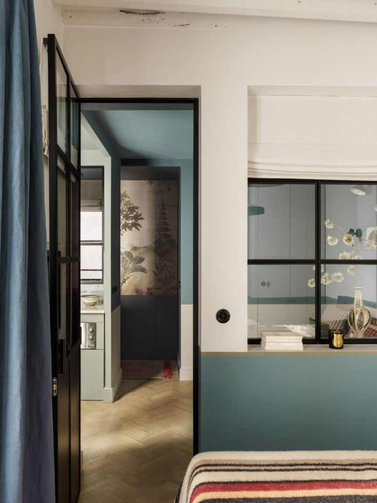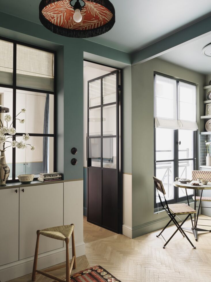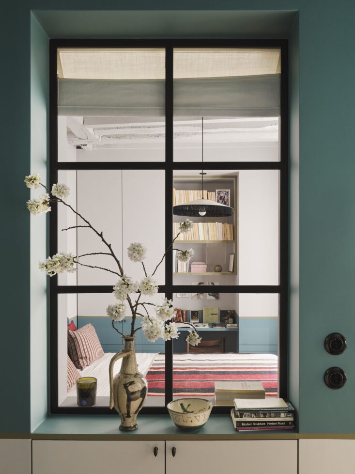 Above: As mentioned, Evennou loves interior windows—we have yet to see a project of hers that doesn’t incorporate inside glazing. And every example sells us all the more: why don’t all remodelers introduce indoor vistas? In this formerly dark apartment, custom steel-framed interior windows draw light into every room and there’s also a balcony.