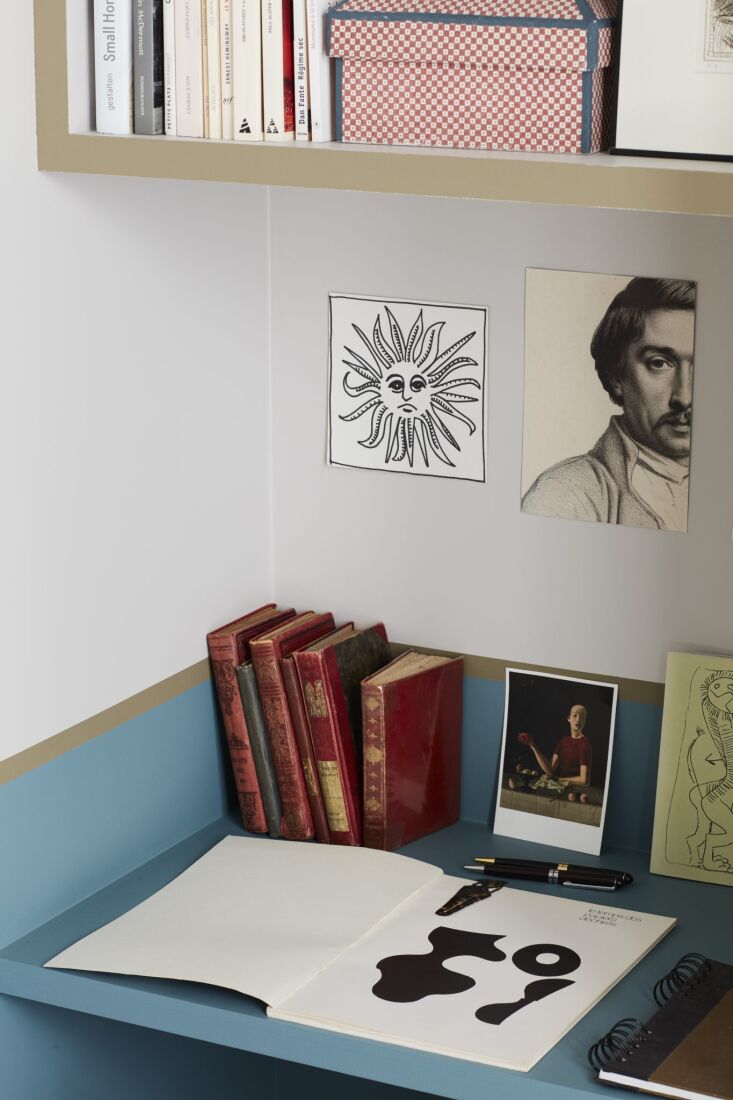 Above: Evennou always finds a place for a desk, and notes that built-ins take up very little space. This one is slotted between two wardrobes that also conceal the water heater.