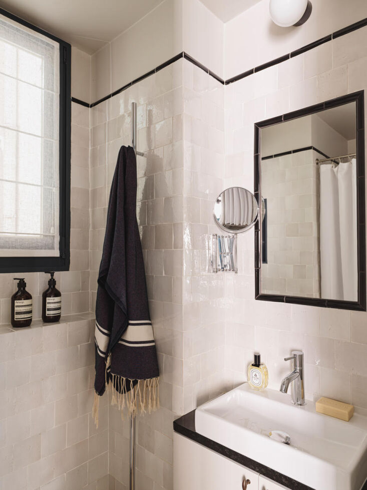 “The tinier it is,” Evennou adds, “the more important it is to make it look nice by working on the small details, such as storage under the sink, a good light, a place to hang towels, and a niche in the shower for the soap and shampoo.” Here, Evennou went with a black-and-white theme. The tiles are Moroccan zellige with a border that she cleverly also used to frame the mirror. Note the linen window shade set off in black.