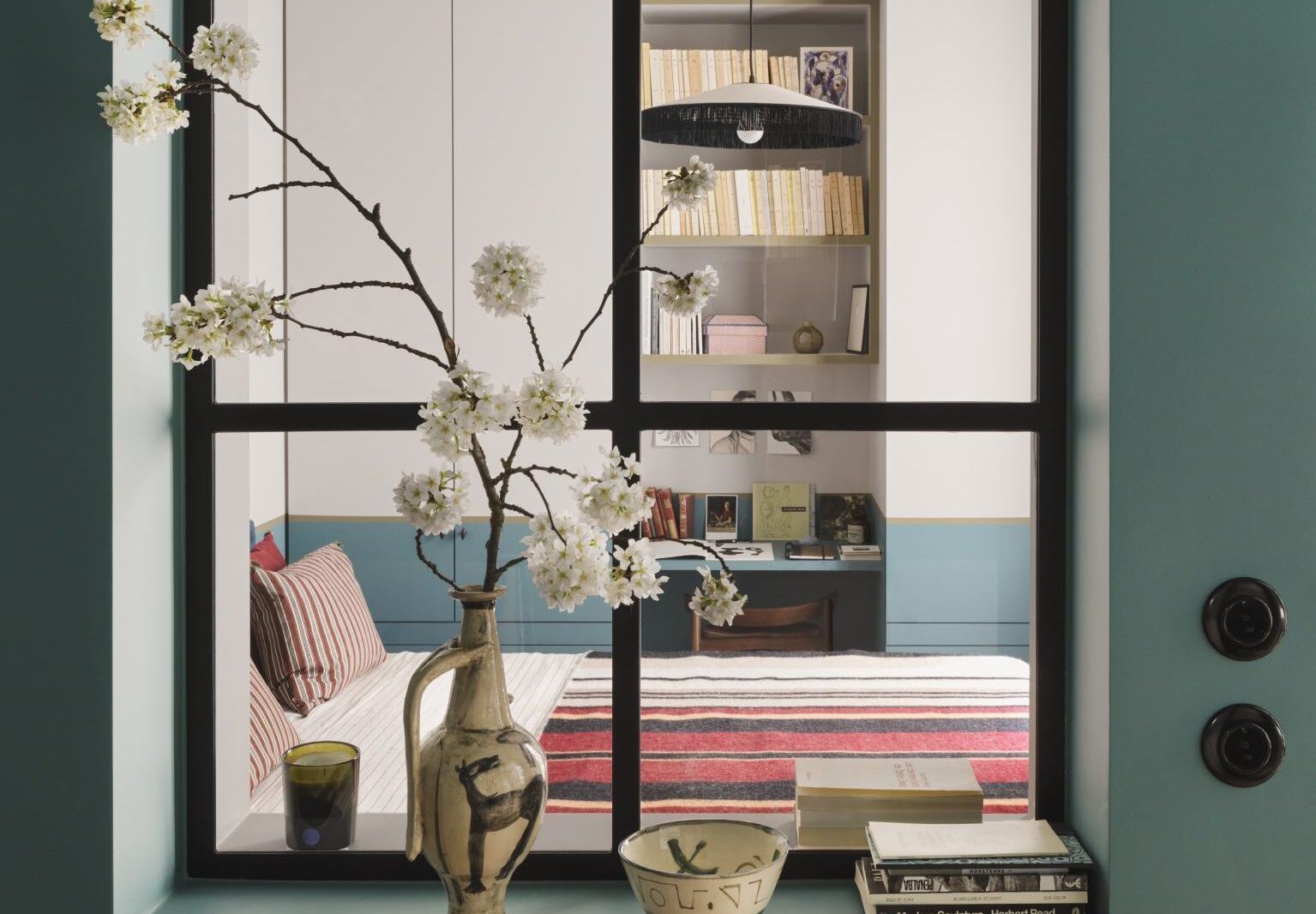 Above: Views from one room to the next make the small spaces feel much more open. “Both the gaze and the light can escape and push back the walls,” says Evennou. Here, a glimpse into the bedroom, which has a linen shade. The black Bakelite light switches are an Evennou favorite by German brand THPG.