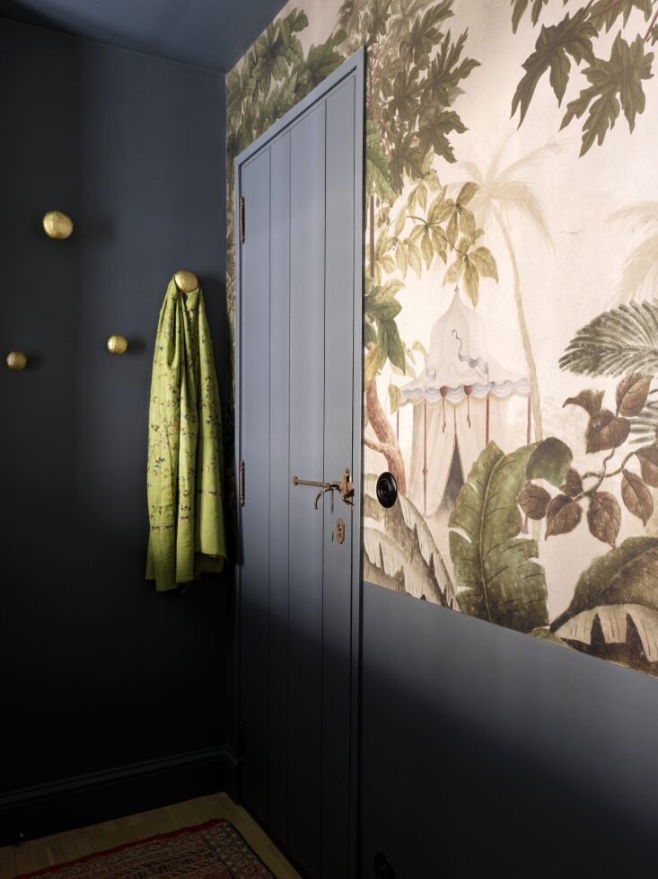Above: Even when space is at a premium, Evennou advocates for an arrival spot to “create a transition between the outside world and your private sphere”— and, of course, to provide a place to stow coats, bags, and shoes. The tropical wallpaper is from Ananbô: “They have a large choice of panoramiques, a very efficient way to make an entrance personal.”
