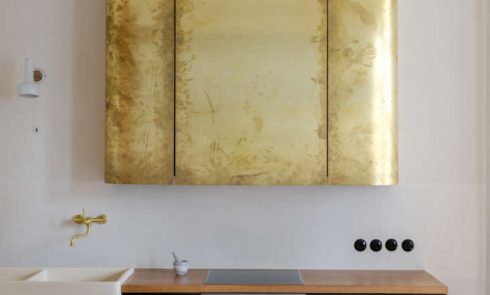 Above: Dual sinks in Carrara marble and the same plywood carried into the bath from the kitchen design.