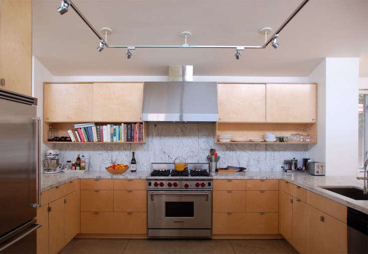 Above: The cabinetry throughout the house is constructed from 13-ply birch plywood and was custom designed by Oreck; the countertops in the kitchen and the baths are Carrara marble from Daltile.