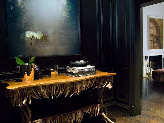 Above: A vintage antler and pine table that Mann found in an antique store in LA contributes to the drama of the dark entry hall painted a dark shade of brown, invented by Mann herself.