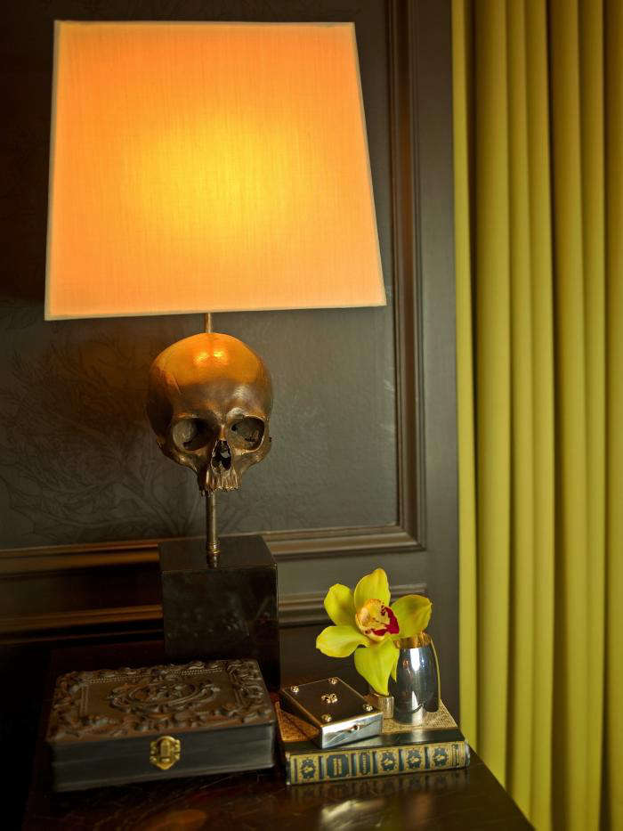 Above: A lover of luxury, Mann’s favorite brands are Hermes and Chrome Hearts: “Classic old-world luxury with an edge.” The skull lamp from Blackman Cruz brings this tension into the apartment.
