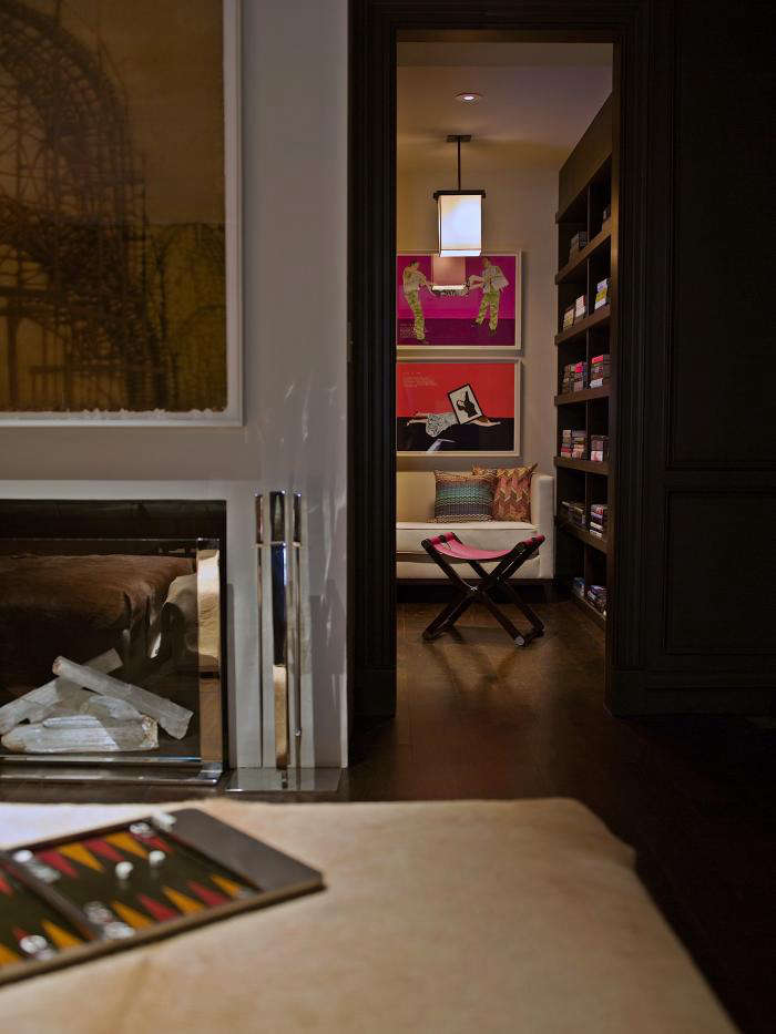 Above: In the media room, with its light colored walls, Mann plays with contrasts again and uses dark furniture.