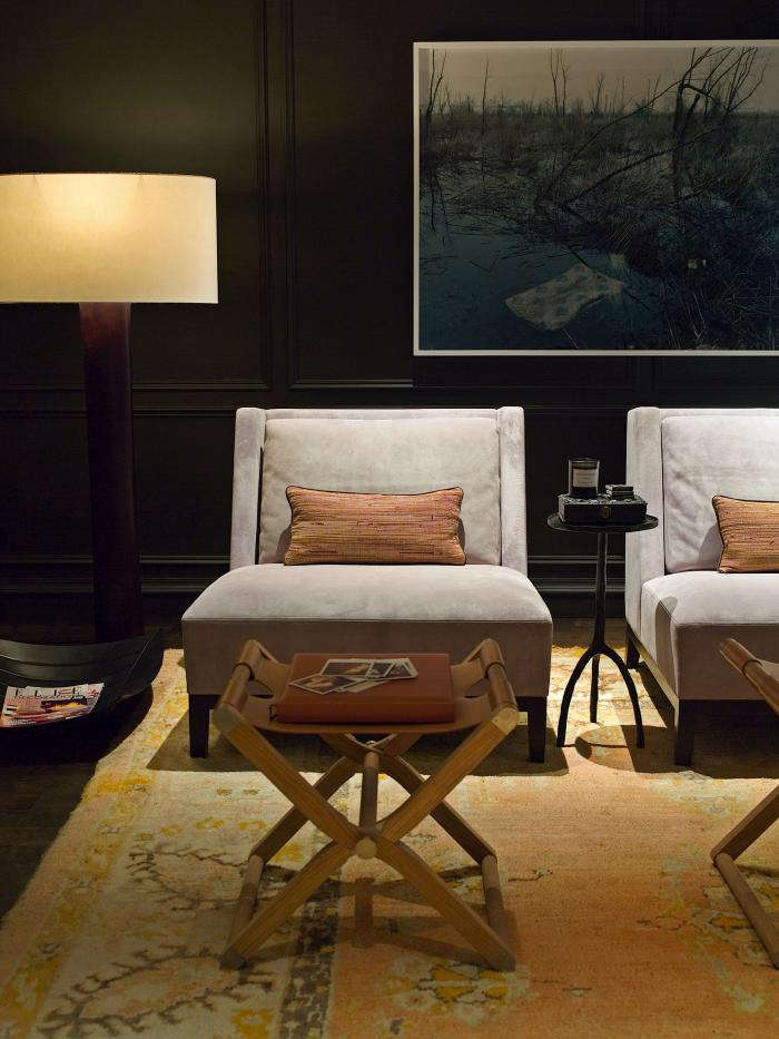 Above: Dark walls and light furniture continue Mann’s theatrical aesthetic. Her brand of luxury speaks of comfort and space. “Everything you put in a room should have a purpose,” she says.