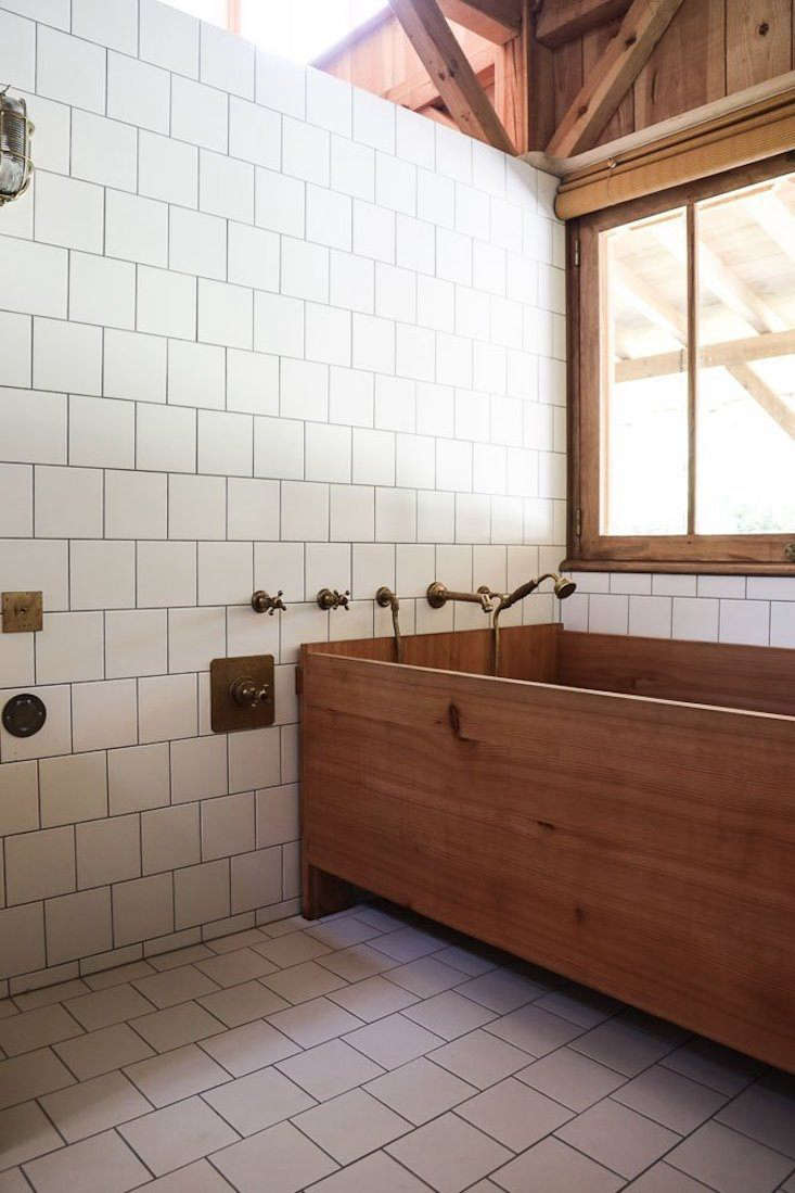 Above: The wood construction extends to the Japanese-style family bathtub. Note the simple square tiles with dark grout applied to both the floor and the partial wall that divides the bathroom from the sink area.