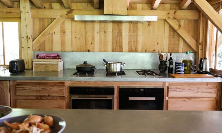 Above: As in all Bartherotte cabins, just about everything is made of the area’s pine and other woods. The kitchen appliances include a Miele Pureline Series Wall Oven.