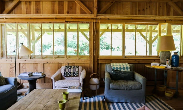The interior is all about wood. Rowland furnished the living area with inviting upholstered pieces, Welsh throws, and midcentury designs. “My style is eclectic, textured, rich and colorful with very strong influences from my travel, my childhood in Mexico, and my husband’s Indian heritage,” she told the Socialite Family. Rowland grew up mostly in London but attended a lycée, and she and her children speak French at home. Fashion runs in her genes: Her sister Anda runs the family’s Savile Row tailor shop, Anderson & Sheppard.