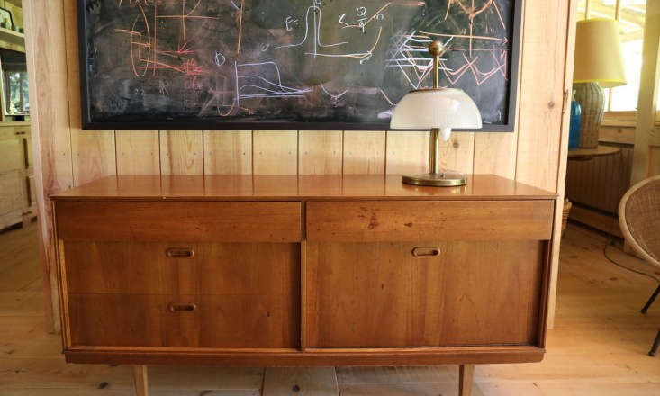 Above: A midcentury credenza is topped by a vintage lamp.,