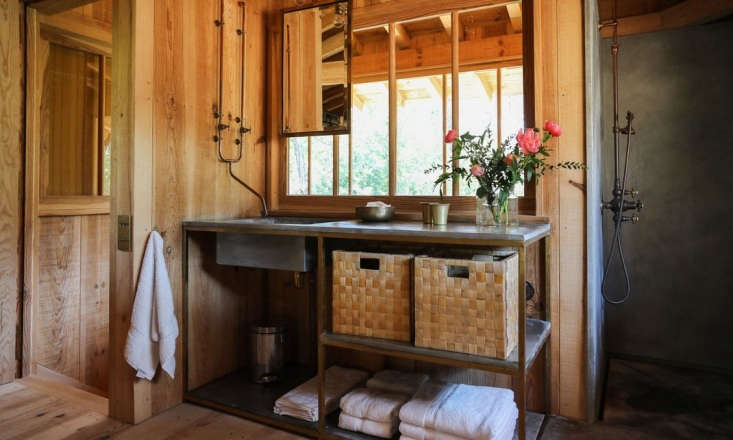 Above: There are three baths; this one has an industrial-style sink unit and exposed piping. (For more faucets like this one, see Trend Alert: 10 DIY Faucets Made from Plumbing Parts.),