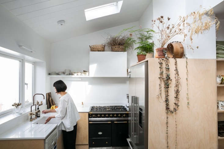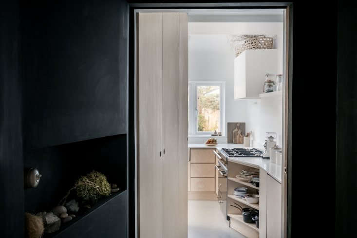 Above: Another view of the kitchen from the hallway reveals the custom ply cabinets. The cabinets to the left are designed with cutout pulls (for more, see Remodeling 101: Cutout Cabinet Pulls). Photograph courtesy of The Modern House in The Botanical Life: Inside Stylist Yasuyo Harvey’s Quiet London Remodel.