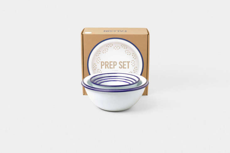 Above: The Falcon Prep Set in White with Blue Rim is $90 at Falcon Enamelware.