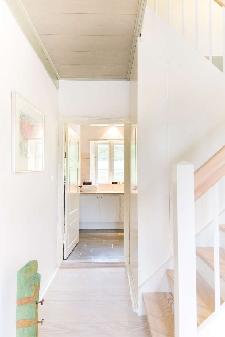 Above: The downstairs bathroom door is painted in tonal off-white with a high-gloss finish.,